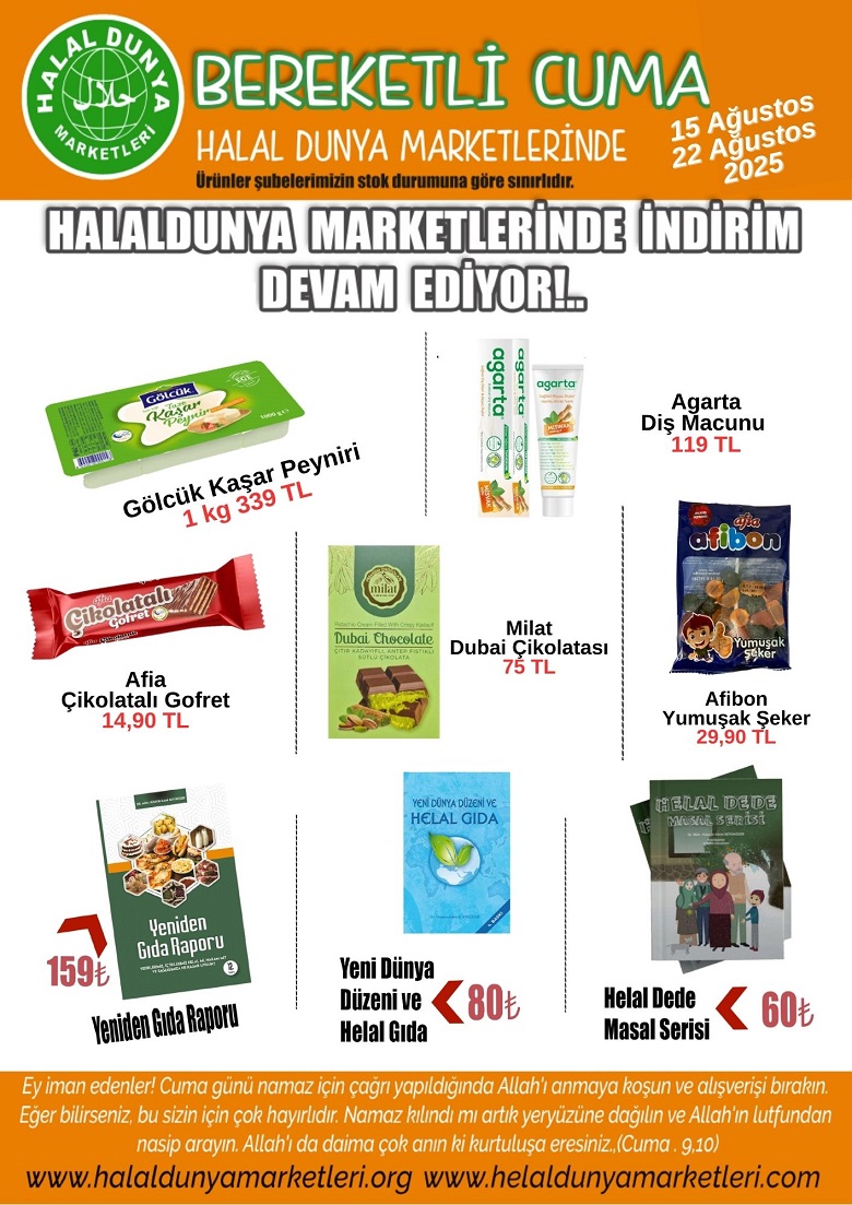 GÖLCÜK kaşar peyniri, AGARTA diş macunu, MİLAT Dubai Çikolatası, AFİBON Yumuşak Şeker, AFİA Çikolatalı Gofret, Yeniden Gıda Raporu, Helal Dede Masalları, Yeni Dünya Düzeni Helal Gıda indirimde!