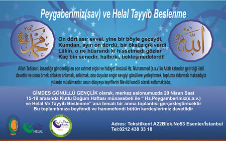 Devamını OkuGİMDES(GIDA VE İHTİYAÇ MADDELERİNİ DENETLEME VE SERTİFİKALANDIRMA ARAŞTIRMALARI DERNEĞİ)NİN OLAĞAN KONGRESİ YAPILDI… AYNI GÜN HZ. PEYGAMBER(s.a.v) VE HELAL TAYYİB BESLENME TOPLANTISI YAPILDI Üyelerine 20 Nisan Saat 10.da yapılacağı yasal iletişim vasıtaları ile bildirilen 4.Olağan Genel Kurul Toplantısı gerçekleştirildi. Toplantı, salt çoşunluğun sağlandığı tesbitinden sonra , Kuran-ı Kerim tilaveti ve dua ile başladı. Teklif üzerine Divan […]