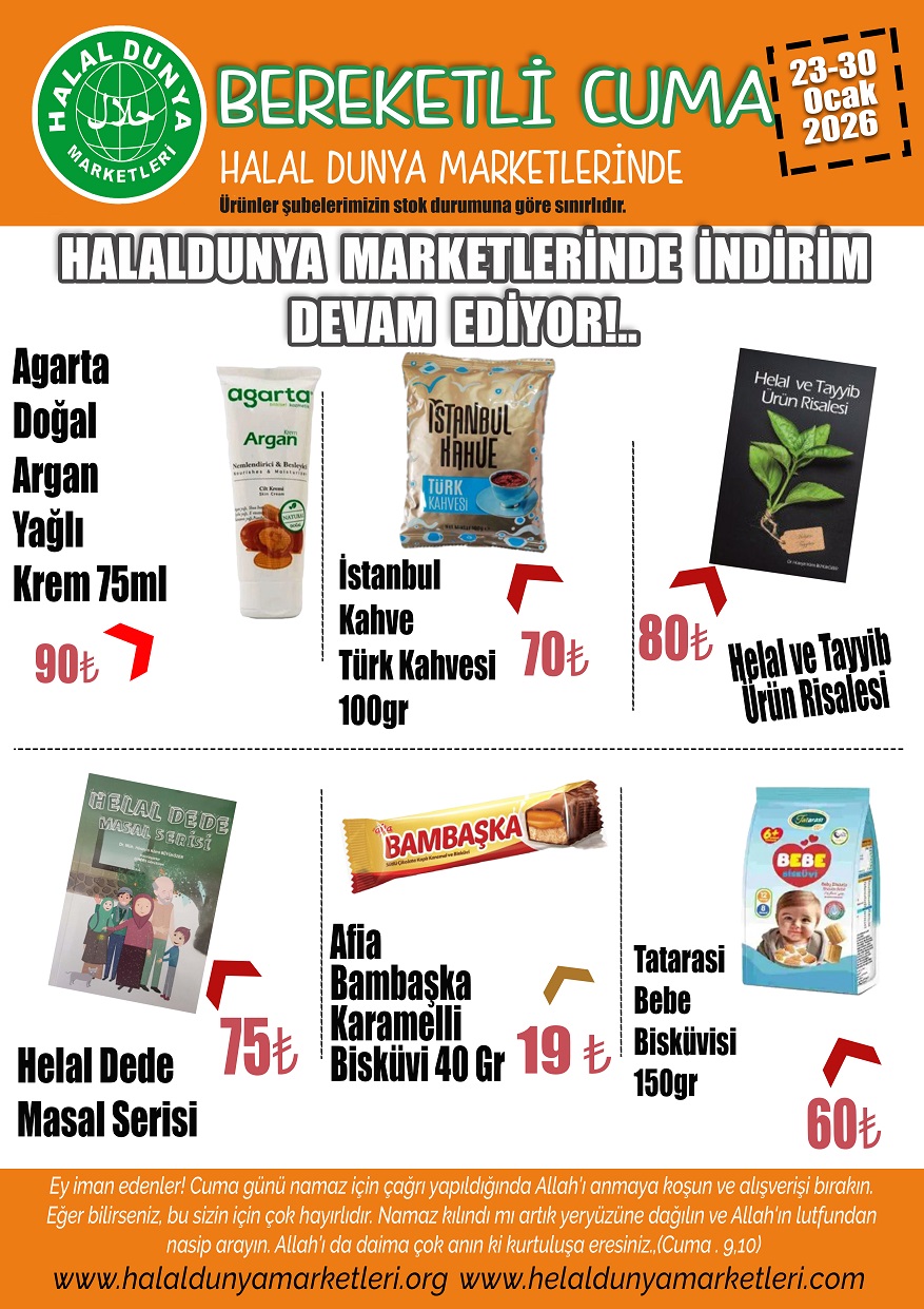 Agarta Doğal Argan Yağlı Krem 75ml, İstanbul Kahve Türk Kahvesi 100gr, Helal ve Tayyib Ürün Risalesi, Helal Dede Masal Serisi, Afia Bambaşka Karamelli Bisküvi 40 Gr, Tatarasi Bebe Bisküvisi 150gr indirimde.